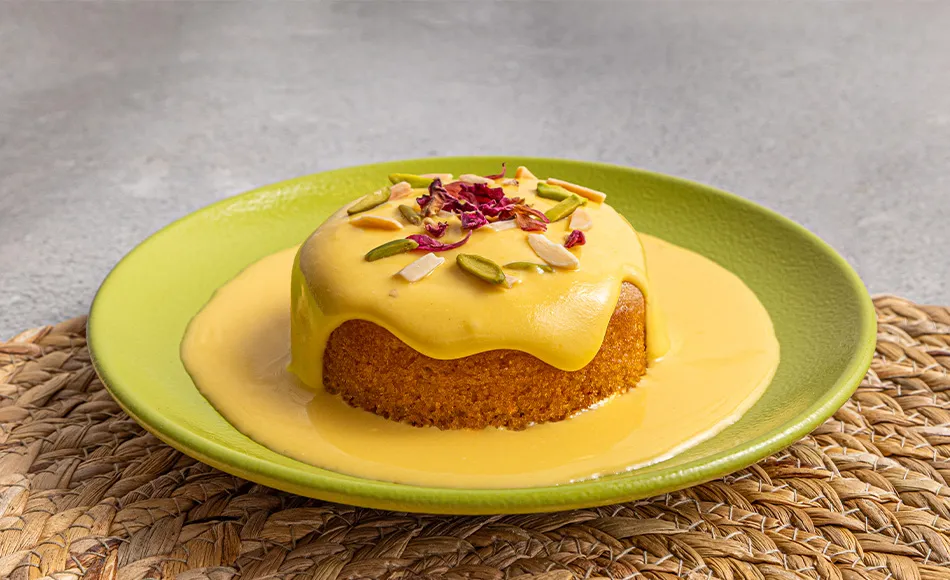 Mango condensed milk-soaked sponge, whipped cream, nuts.
