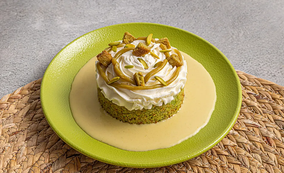 Pistachio ganache, whipped cream, pistachio sponge, crunchy pistachio crumble.